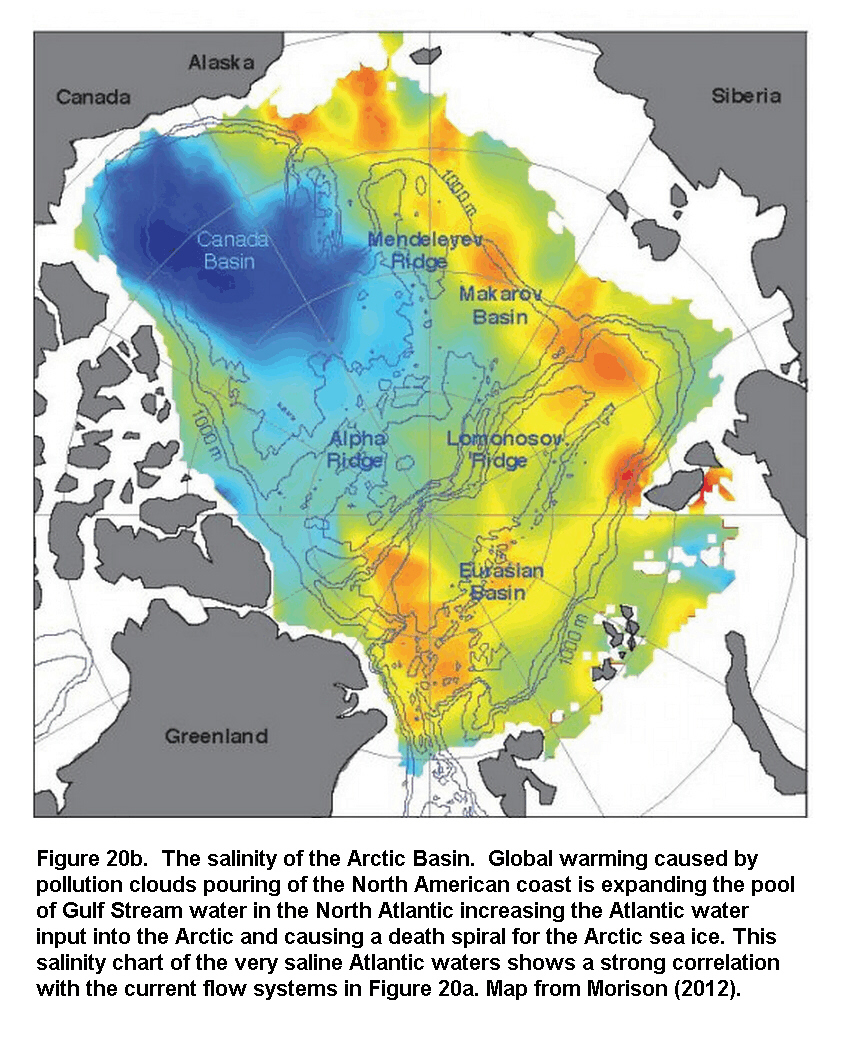 The salinity variation of the Arctic Ocean waters are shown on Figure 20b and indicates two distinct regional zones, the Beaufort Sea where fresher waters are entering from the North American continent and the trend of the more saline Gulf Stream (Atlantic) waters entering via the Fram Straight west of Svalbard (Morison 2012). The general Gulf Stream (Atlantic Waters) flow region defined by this salinity chart (Figure 20b) shows a very strong correlation with the current flow systems defined in Figure 20a and very high salinity regions correlate with the extreme methane eruption points at the end of the Eurasian Basin in Figure 20a. This may result from the saline Gulf Stream currents running aground on the methane hydrate slope region where they are not being able to mix more freely with the shallower fresher waters of the shelf. Global warming is heating and expanding the pool of Gulf Stream water in the North Atlantic, increasing the Gulf Stream input into the Arctic, causing a death spiral for Arctic sea ice which is making the weather systems more extreme (Morison 2012). This local Global warming appears directly related to pollution clouds pouring off the east coast of the North American continent heating the Gulf Stream waters and generating the most extreme oceanic evaporation area on Earth in the Atlantic (Figure 22b - from Lavatus Prodeo 2012).
